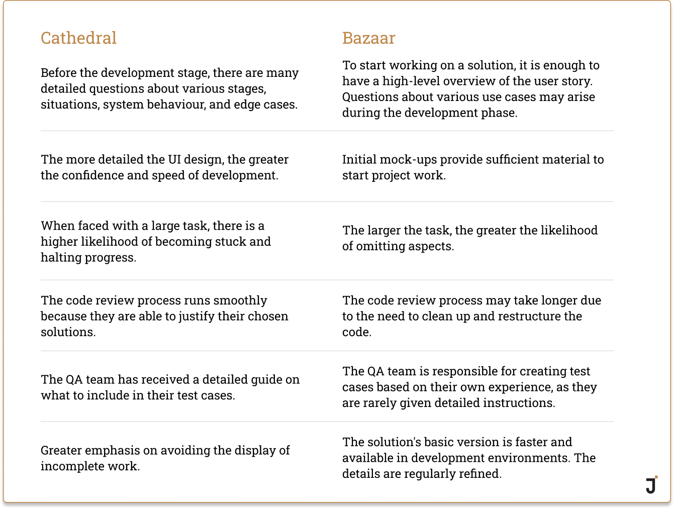 Recognizing the working style of each individual in the team is crucial. This will allow you to better manage the resources you have. If you have a whole team of people who work in the Cathedral style, it's great for projects where details matter. On the other hand, Bazaar people will feel like a fish in water when they are developing the MVPs.